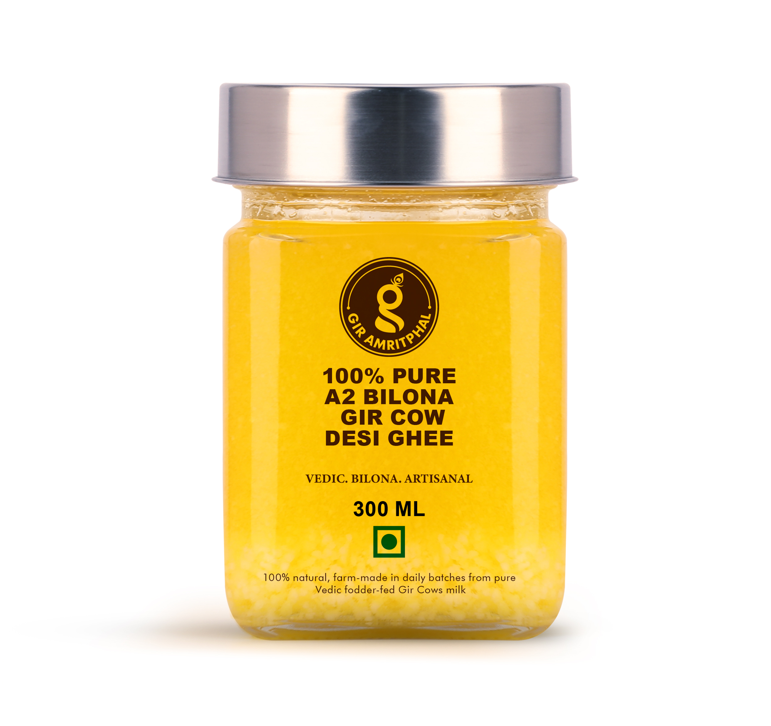 • VEDIC PROCESS. Pure and premium A2 Gir cow milk is first turned into curd using a curd starter. The set curd is churned bi-directionally for hours at pre-dawn (Brahmamahurat) to obtain butter, using the ayurvedic Bilona method. The butter is then slow-cooked to get pure A2 Desi Ghee. 1 liter of Gir Amritphal A2 Desi Gir Cow Ghee requires 30 liters of Gir cow A2 milk.